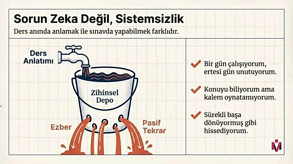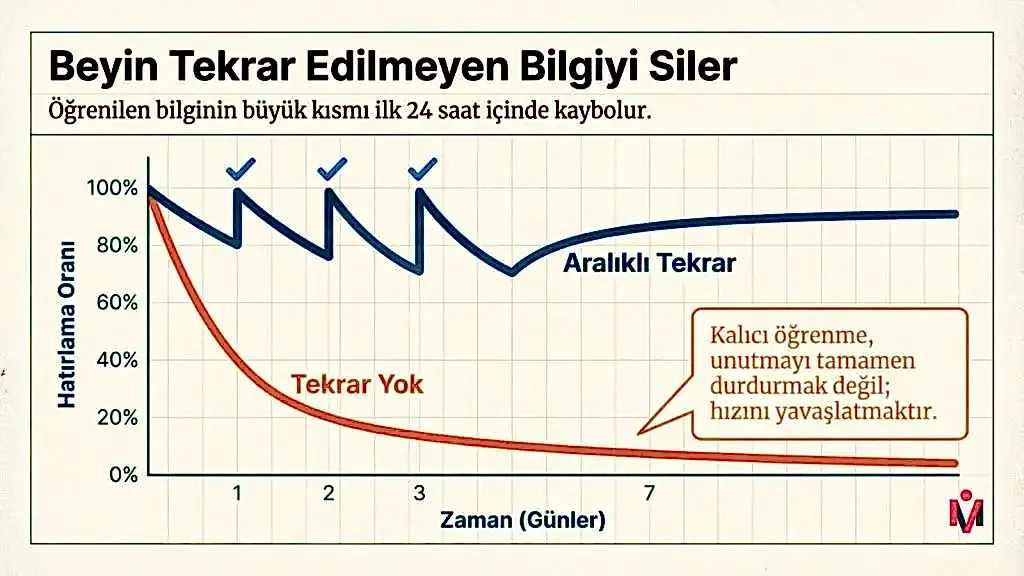 Bir konuyu çalıştıktan birkaç gün sonra zorlanıyorsanız, bu zeka sorunu değildir. Bu, beynin doğal çalışma biçimidir. Kalıcı öğrenmeyi anlamak için önce şu gerçeği kabul etmeliyiz: Beyin tekrar edilmeyen bilgiyi silmeye eğilimlidir.