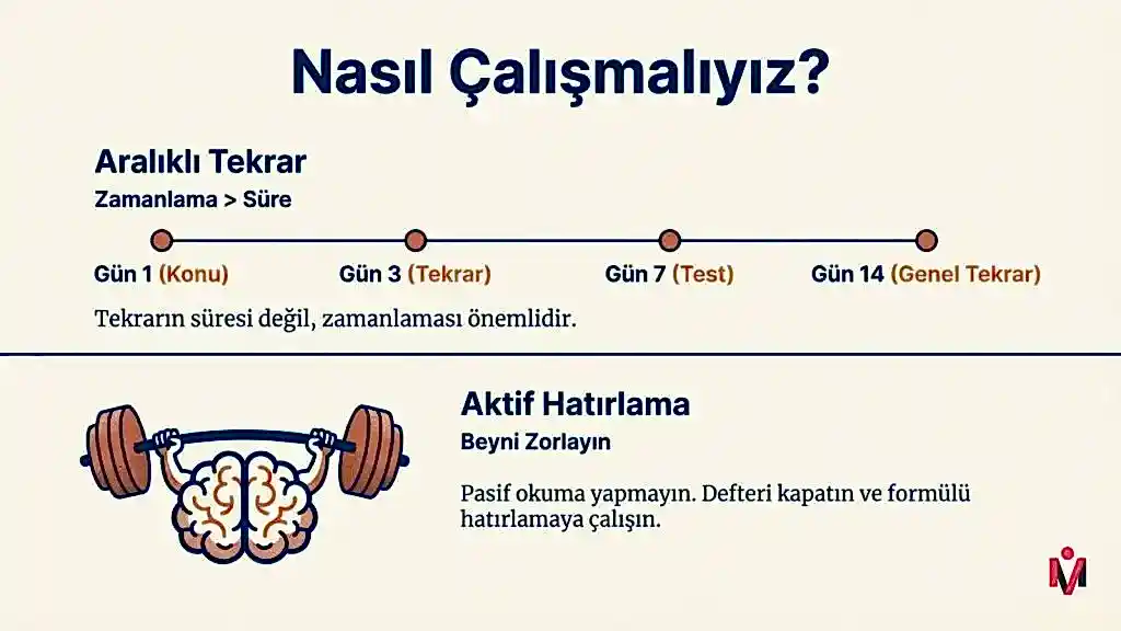 Tekrarın zamanı, tekrarın süresinden daha önemlidir. Aynı gün 2 saat tekrar yapmak yerine, 3 gün arayla 15’er dakika tekrar yapmak çok daha etkilidir. Bu yöntem “aralıklı tekrar” olarak bilinir.
