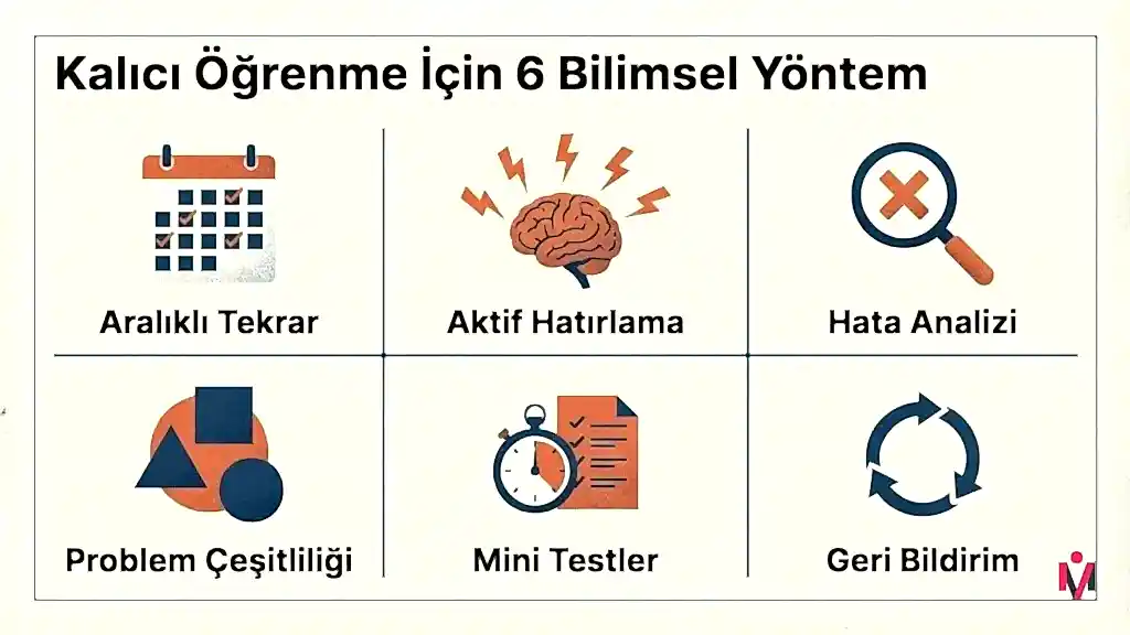Kalıcı öğrenme rastgele değil, sistemli bir süreçtir. Aşağıdaki 5 adım birlikte uygulandığında matematikte bilgi kalıcılığı belirgin şekilde artar: